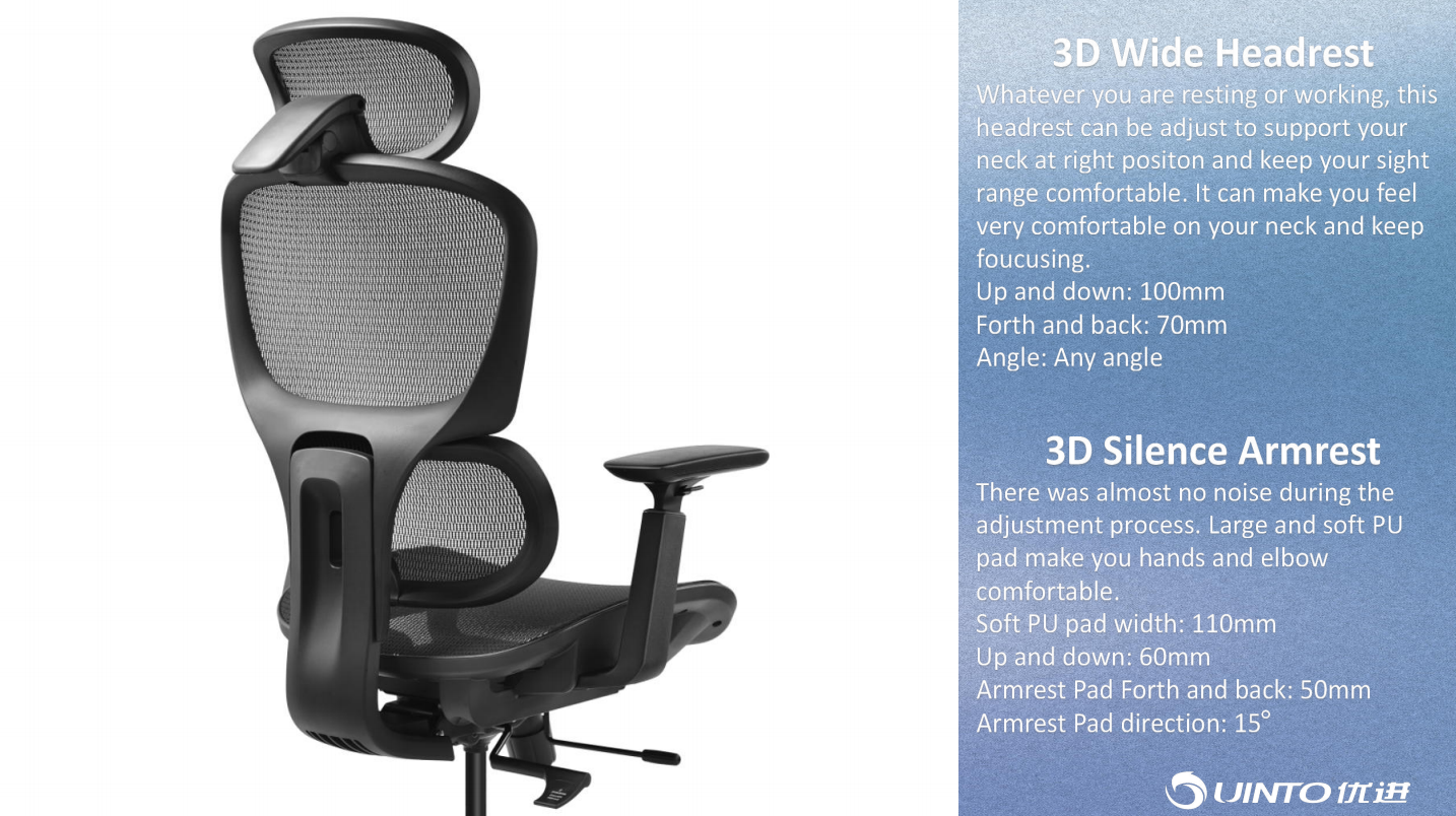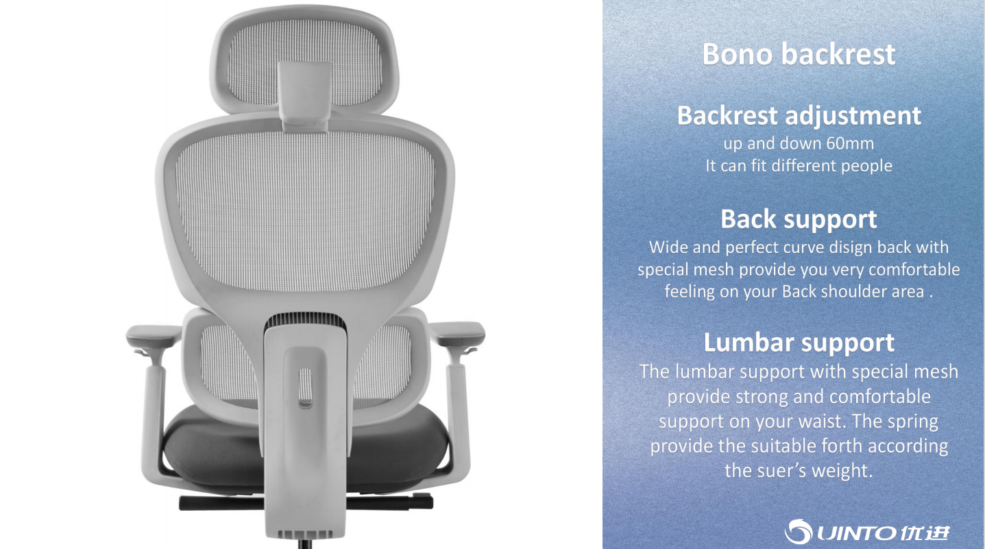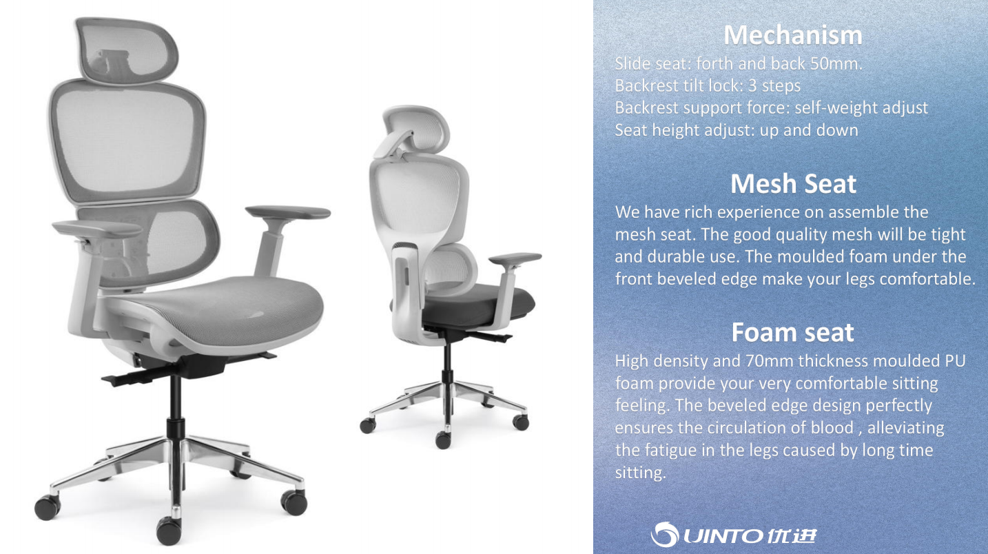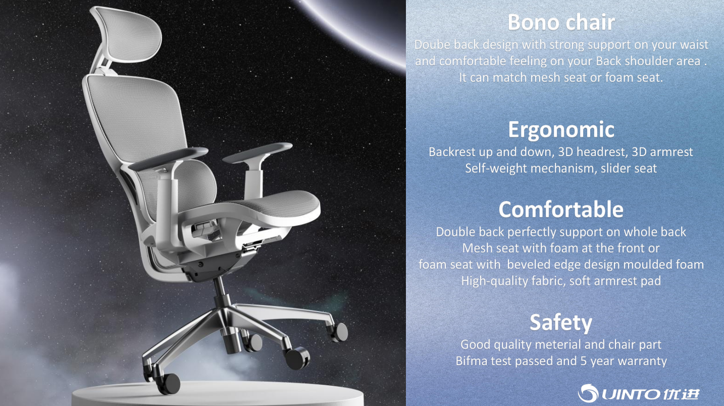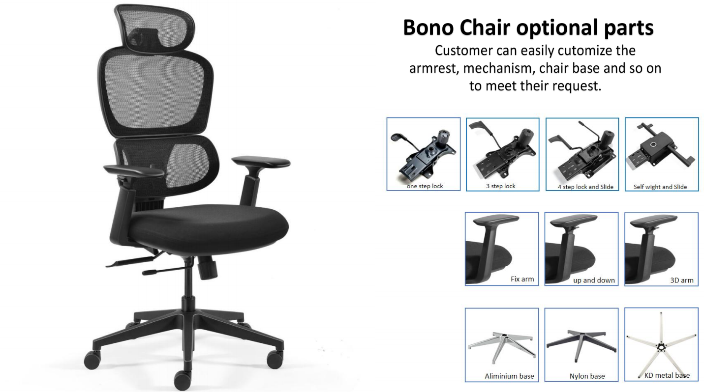 Double back design, backrest up and down, all mesh seat or foam seat. Optional mechanism, armrest, chair base.